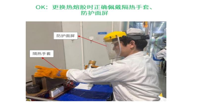 根據(jù)企業(yè)需求,識(shí)別安全作業(yè)時(shí)是否違規(guī)未穿戴防護(hù)裝置現(xiàn)存問題點(diǎn):更換熱熔膠時(shí),人員有時(shí)未按規(guī)范操作,易發(fā)生安全隱患,需現(xiàn)場(chǎng)語音提示并將該事件記錄解決方案:攝像機(jī)部署在工位上,識(shí)別人員手部有無佩戴隔熱手套,頭部有無佩戴防護(hù)面罩,若無觸發(fā)告警